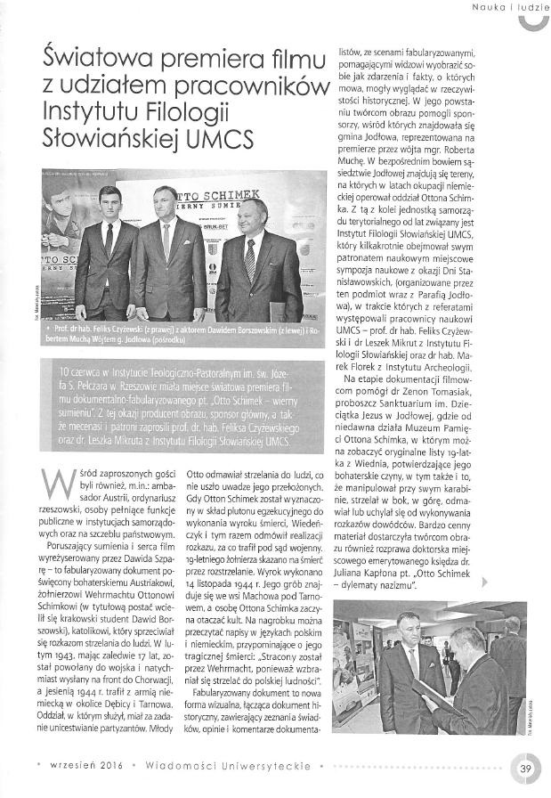 W załączeniu artykuł, jaki ukazał się w Nr 7/226 Wiadomości Uniwersyteckich zatytułowany "Światowa premiera filmu z udziałem pracowników Instytutu Filologii Słowiańskiej UMCS"