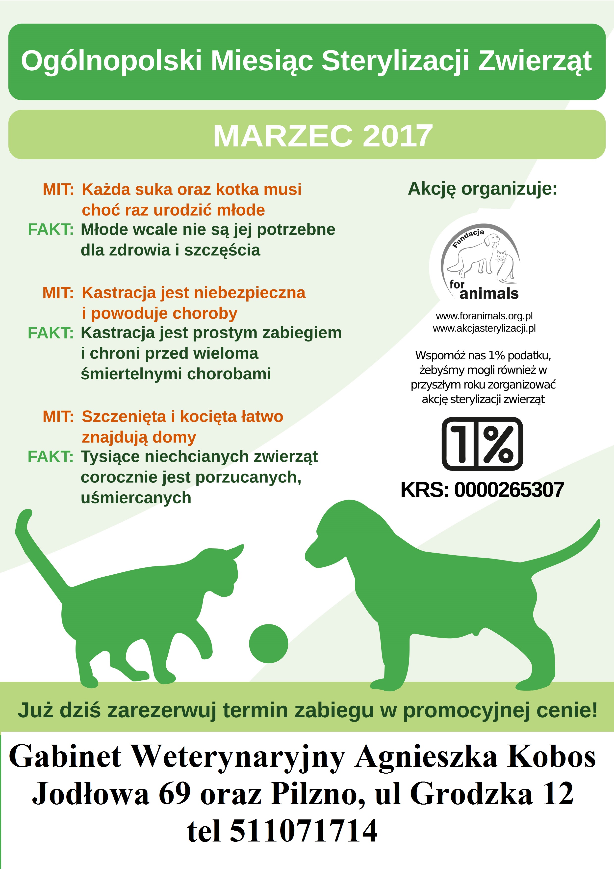 Fundacja For Animals oraz Wójt Gminy Jodłowa informują, że w związku z Ogólnopolską Akcją Sterylizacji i Kastracji Psów i Kotów – Marzec 2017 zabiegi w promocyjnych cenach przeprowadzane będą w Gabinecie Weterynaryjnym Agnieszka Kobos, Pilzno, ul Grodzka 12 tel. 511 071 714
