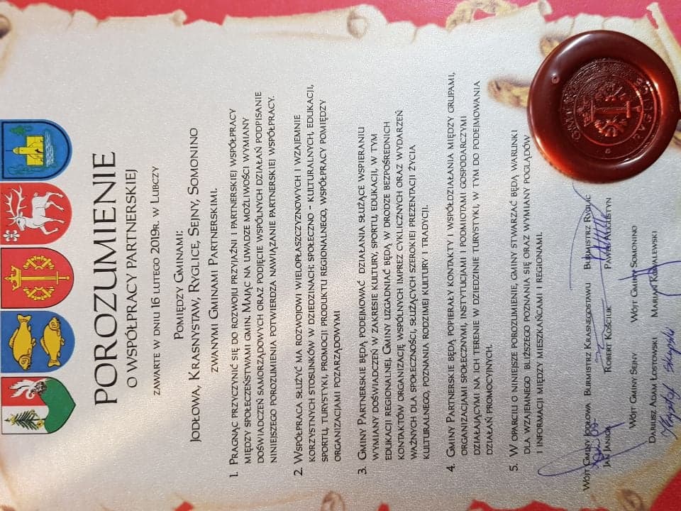 16 lutego 2019r. w trakcie obchodów uroczystości Św. Walentego Tradycje Lubeckie SERCEM GOTOWANE włodarze gmin: Paweł Augustyn-Burmistrz Ryglic, Jan Janiga - Wójt Gminy Jodłowa, Robert Kościuk-Burmistrz Krasnegostawu, Krzysztof Skupski w imieniu Dariusza Lostowskiego - Wójta Gminy Sejny oraz Marian Kowalewski - Wójt Gminy Somonino podpisali porozumienie o współpracy partnerskiej.