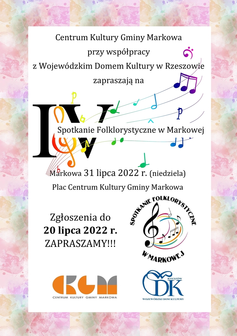 Centrum Kultury Gminy Markowa przy współpracy z WDK w Rzeszowie, już po raz 4 organizuje Spotkanie Folklorystyczne w Markowej, które odbędzie się w dniu 31 lipca 2022 r.
