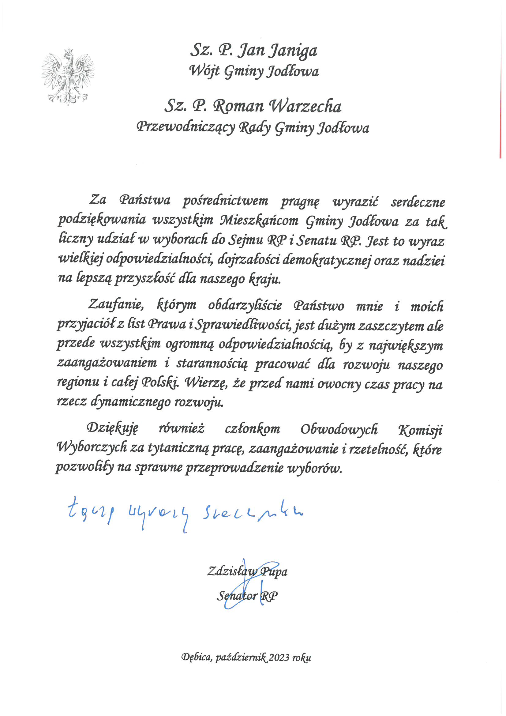 Podziękowanie dla mieszkańców Gminy Jodłowa od Senatora RP Zdzisław Pupa
