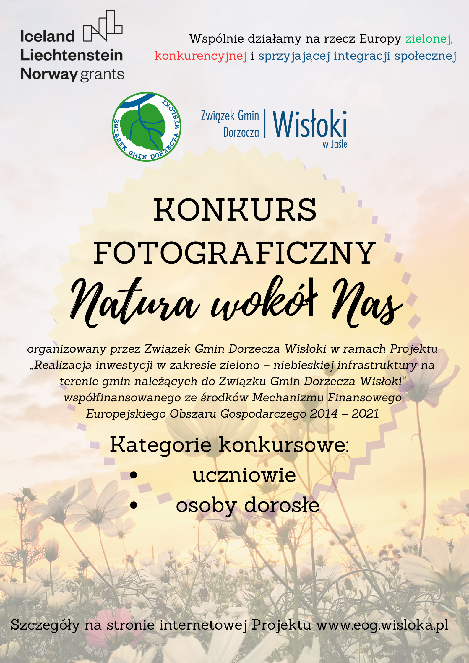 Związek Gmin Dorzecza Wisłoki zaprasza serdecznie do udziału w konkursie fotograficznym „Natura wokół Nas”, organizowanym w ramach Projektu pn. „Realizacja inwestycji w zakresie zielono-niebieskiej infrastruktury na terenie gmin należących do Związku Gmin Dorzecza Wisłoki” w ramach Programu „Środowisko, Energia i Zmiany Klimatu”, obszar programowy: Klimat, współfinansowanego ze środków Mechanizmu Finansowego Europejskiego Obszaru Gospodarczego 2014-2021.