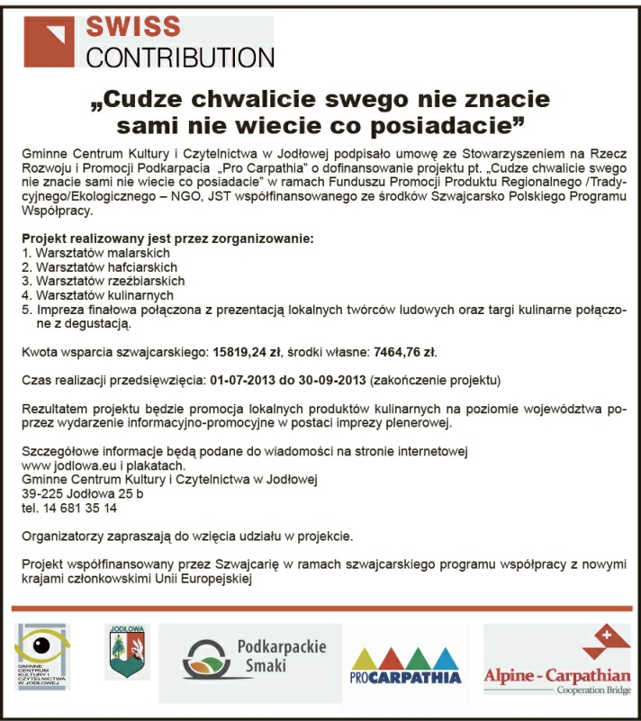 Gminne Centrum Kultury i Czytelnictwa w Jodłowej podpisało umoę ze Stowarzyszeniem na Rzecz Rozwoju i Promocji Podkarpacia "PRO CARPATHIA" o dofinansowaniu projektu pt "Cudze chwalicie swego nie znacie, sami nie wiecie co posiadacie"