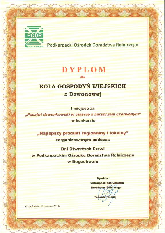 W konkursie tym udział wzięło również Stowarzyszenie Koło Gospodyń Wiejskich z Dzwonowej, wytypowane jako jedyne z powiatu dębickiego. KapitułA konkursu ,,Najlepszy produkt regionalny i lokalny”: przewodniczący Jerzy Wiśniewski - Wojewódzki Inspektor Jakości Handlowej Artykułów Rolno - Spożywczych w Rzeszowie oraz członkowie Monika Sterer - Urząd Marszałkowski, Ewa Niedziałek Szeliga - Polskie Radio Rzeszów, Stanisław Kawa - Podkarpacki Ośrodek Doradztwa Rolniczego, Barbara Rajzauer - Podkarpacki Ośrodek Doradztwa Rolniczego dokonała oceny 45 produktów zgłoszonych przez 10 zakładów przetwórczych, 1 gospodarstwo ekologiczne, 3 stowarzyszenia, 6 kół gospodyń wiejskich i 1 gospodarstwo agroturystyczne.