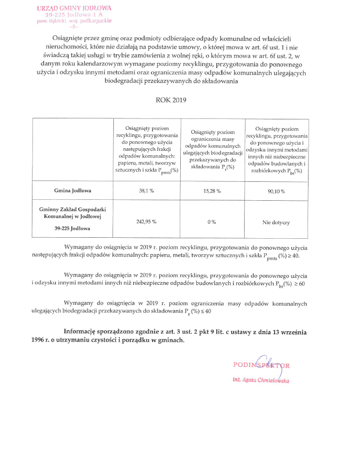 Osiągnięte przez gminę oraz podmioty odbierające odpady komunalne od właścicieli nieruchomości, które nie działają na podstawie umowy, o której mowa w art. 6f ust. 1, i nie świadczą takiej usługi w trybie zamówienia z wolnej ręki, o którym mowa w art. 6f ust. 2, w danym roku kalendarzowym wymagane poziomy recyklingu, przygotowania do ponownego użycia i odzysku innymi metodami oraz ograniczenia masy odpadów komunalnych ulegających biodegradacji przekazywanych do składowania