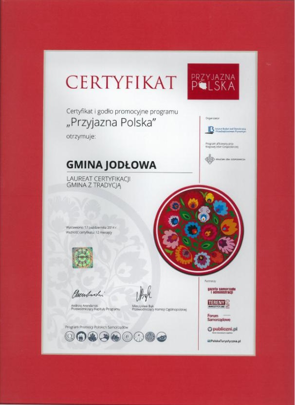 W bieżącym roku Gmina Jodłowa wzięła udział w I edycji programu „Przyjazna Polska” oraz dodatkowej certyfikacji tematycznej „Gmina z Tradycją”. Gmina została poddana odpowiednim procedurom certyfikacyjnym i spełniła wymogi regulaminowe, w związku z czym decyzją Kapituły programu uzyskała tytuł i certyfikat „Przyjazna Polska” 2014 oraz certyfikat tematyczny „Gmina z Tradycją”.