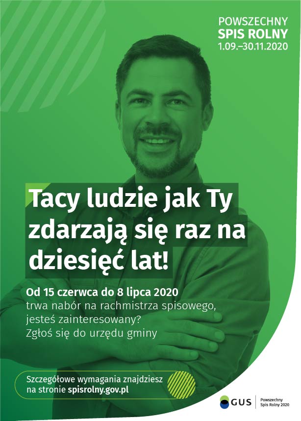 Wójt Gminy Jodłowa - Gminny Komisarz Spisowy informuje, że w okresie od 15 czerwca 2020 r. do 8 lipca 2020 r. prowadzony jest otwarty i konkurencyjny nabór kandydatów na rachmistrzów terenowych do powszechnego spisu rolnego w 2020 r. na terenie Gminy Jodłowa.