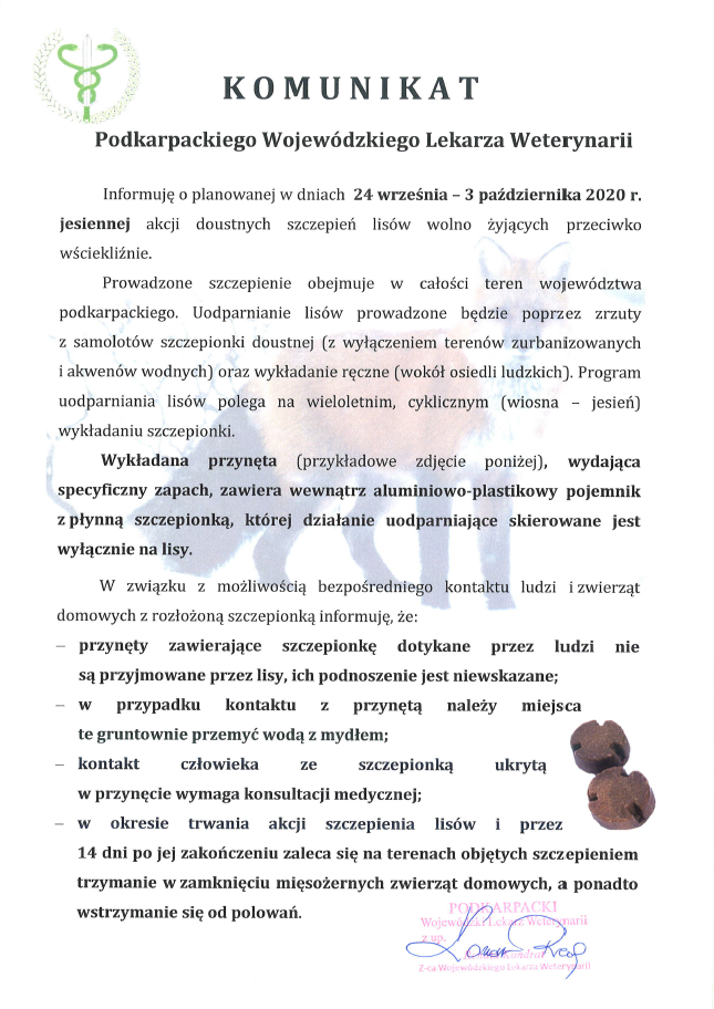 Komunikat Podkarpackiego Wojewódzkiego Lekarza Weterynarii o planowanej akcji szczepień lisów