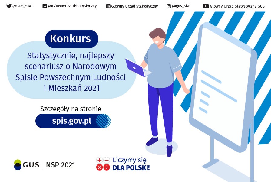 W związku z trwającym Narodowym Spisem Powszechnym Ludności i Mieszkań 2021 Główny Urząd Statystyczny zorganizował konkurs „Statystycznie, najlepszy scenariusz o NSP 2021”. Konkurs przeprowadzony zostanie w dniach 1 września – 30 września 2021 r. Do wygrania atrakcyjne nagrody. Szczegóły na stronie konkursu: https://spis.gov.pl/najlepszy-scenariusz-o-nsp-2021/.
