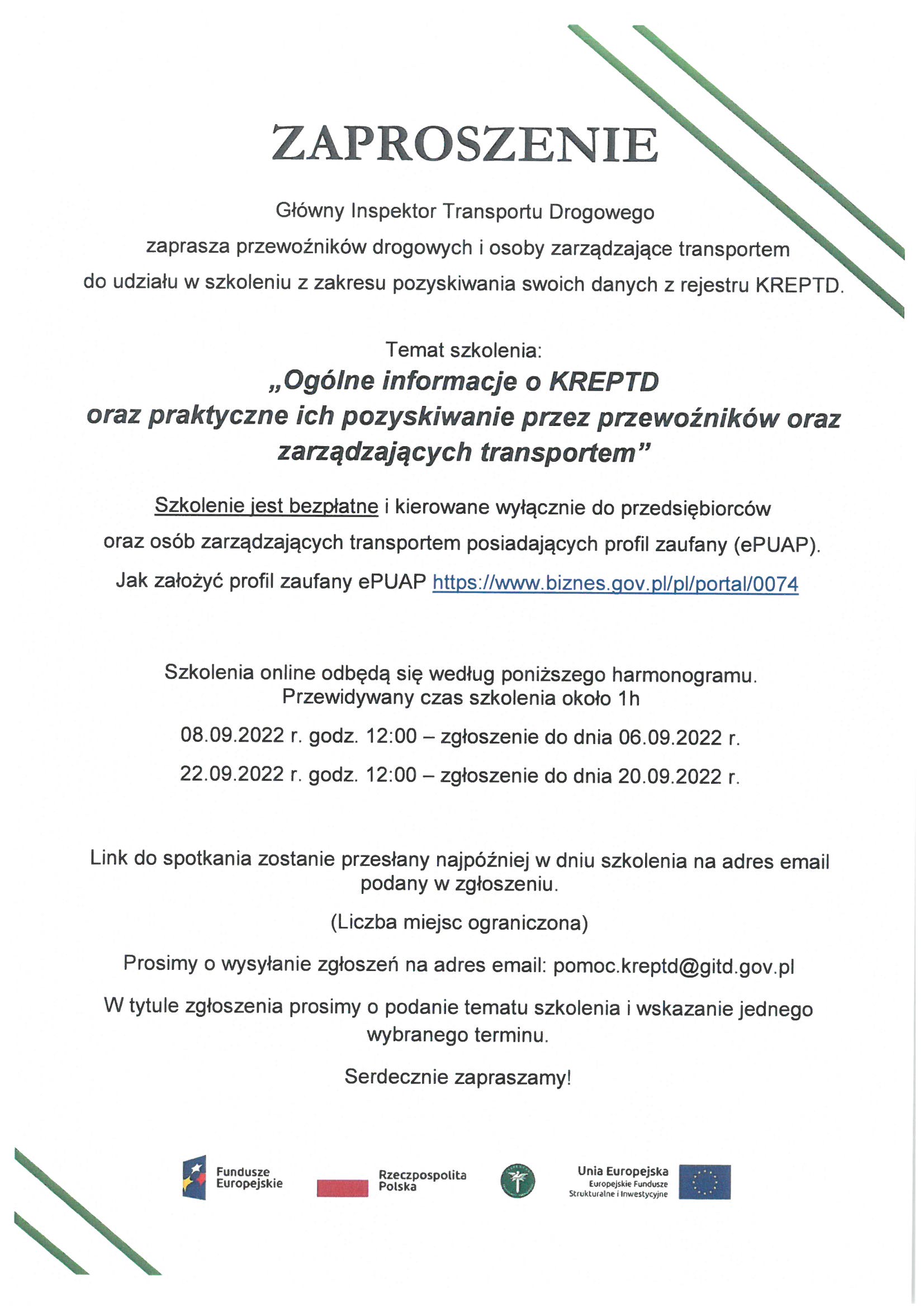 Zaproszenie przewoźników drogowych na szkolenie z zakresu pozyskiwania swoich danych z rejestru KREPTD