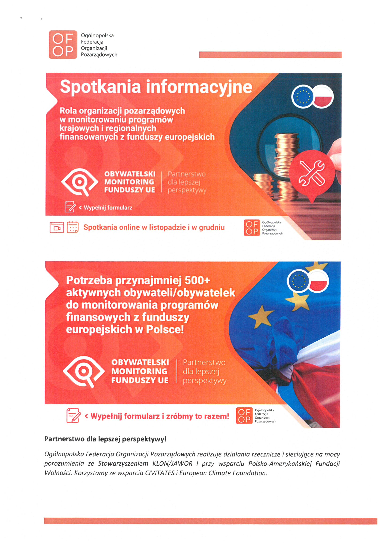 OFOP zachęca do wypełnienia formularza celem analizy możliwości i potencjału organizacji pozarządowych do prac w komitetach monitorujących i współpracy w tym zakresie. Organizacje mogą liczyć na możliwość wymiany doświadczeń, wsparcie specjalistów, udział w spotkaniach informacyjnych i przygotowawczych, m.in. 9 listopada i 14 grudnia. Zgłoszenia zainteresowanych osób, które chcą otrzymywać aktualne informacje i korzystać ze wsparcia OFOP przyjmowane są przez formularz - link: https://bit.lv/3PBlPkH