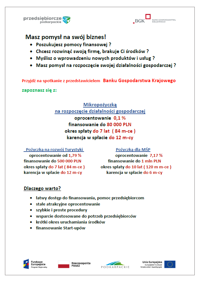 Udział w spotkaniach jest bezpłatny, a w zamian otrzymujesz praktyczną wiedzę na temat pożyczek unijnych – udzielanych na warunkach znacznie korzystniejszych niż rynkowe. Dzięki pomocy eksperta BGK, z łatwością zapoznasz się z całą potrzebną dokumentacją.