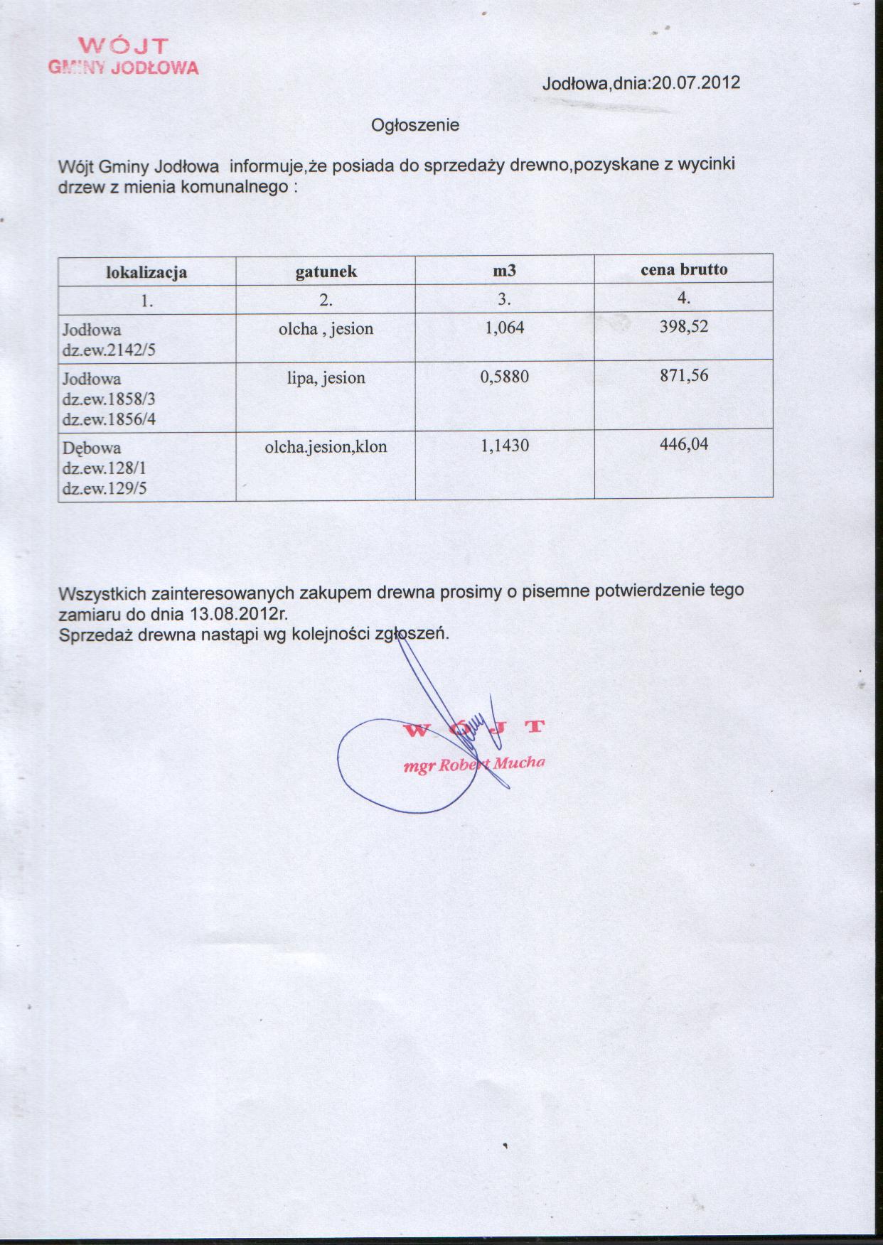 Ogłoszenie Wójta Gminy o sprzedaży drewna pozyskanego z wycinki drzew z mienia komunalnego