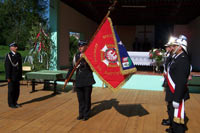 W czasie mszy św. Ksiądz Proboszcz poświęcił nowy sztandar dla jednostki OSP w Jodłowej, na którym widnieje oprócz postaci Św. Floriana ? patrona Strażaków ? figurka Dzieciątka Jezus. Dalsza część obchodów wielkiego jubileuszu rozpoczęła się złożeniem meldunku o gotowości jednostek do rozpoczęcia uroczystości przez dowódcę uroczystości druha Adama Wala druhowi Władysławowi Tabaszowi ? Vi-ce Prezesowi Zarządu Wojewódzkiego Związku Ochotniczej Straży Pożarnej Rzeczypospolitej Polskiej .W międzyczasie orkiestra dęta OSP z Jodłowej odegrała marsza powitalnego. Kolejnym punktem programu było podniesienie flagi państwowej przez poczet flagowy. Zgodnie z przyjętym ceremoniałem orkiestra odegrała nasz hymn narodowy w trakcie podnoszenia flagi.