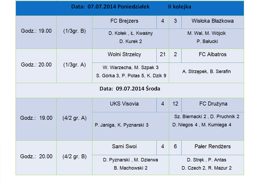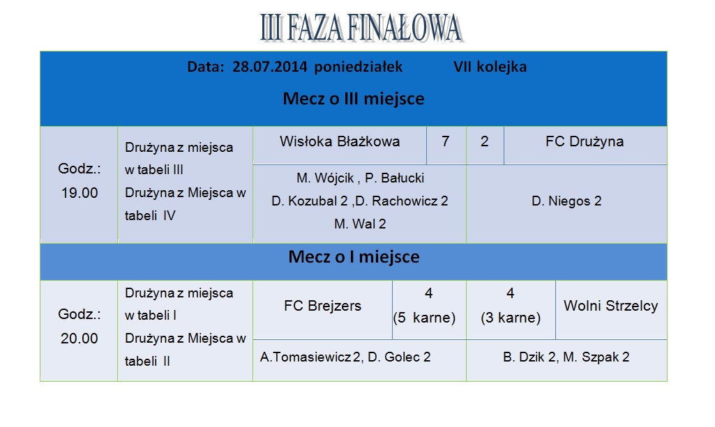 Mecz ten zasługiwał na wielki finał, dostarczył pięknych emocji dla kibiców licznie zgromadzonych na Orliku. W regulaminowym czasie gry bliżej zwycięstwa była drużyna FC Brejzers która to prowadziła 3:1, ale drużyna Wolnych strzelców walczyła do ostatniego gwizdka i doprowadziła do remisu 3:3 , a później strzelając bramkę w dogrywce na 4:3 była blisko końcowego triumfu. . Ale znowu w końcówce dogrywki FC Brejzers pokazała charakter doprowadzając do rzutów karnych, w których miała więcej szczęścia sportowego, wygrywając 5:3.