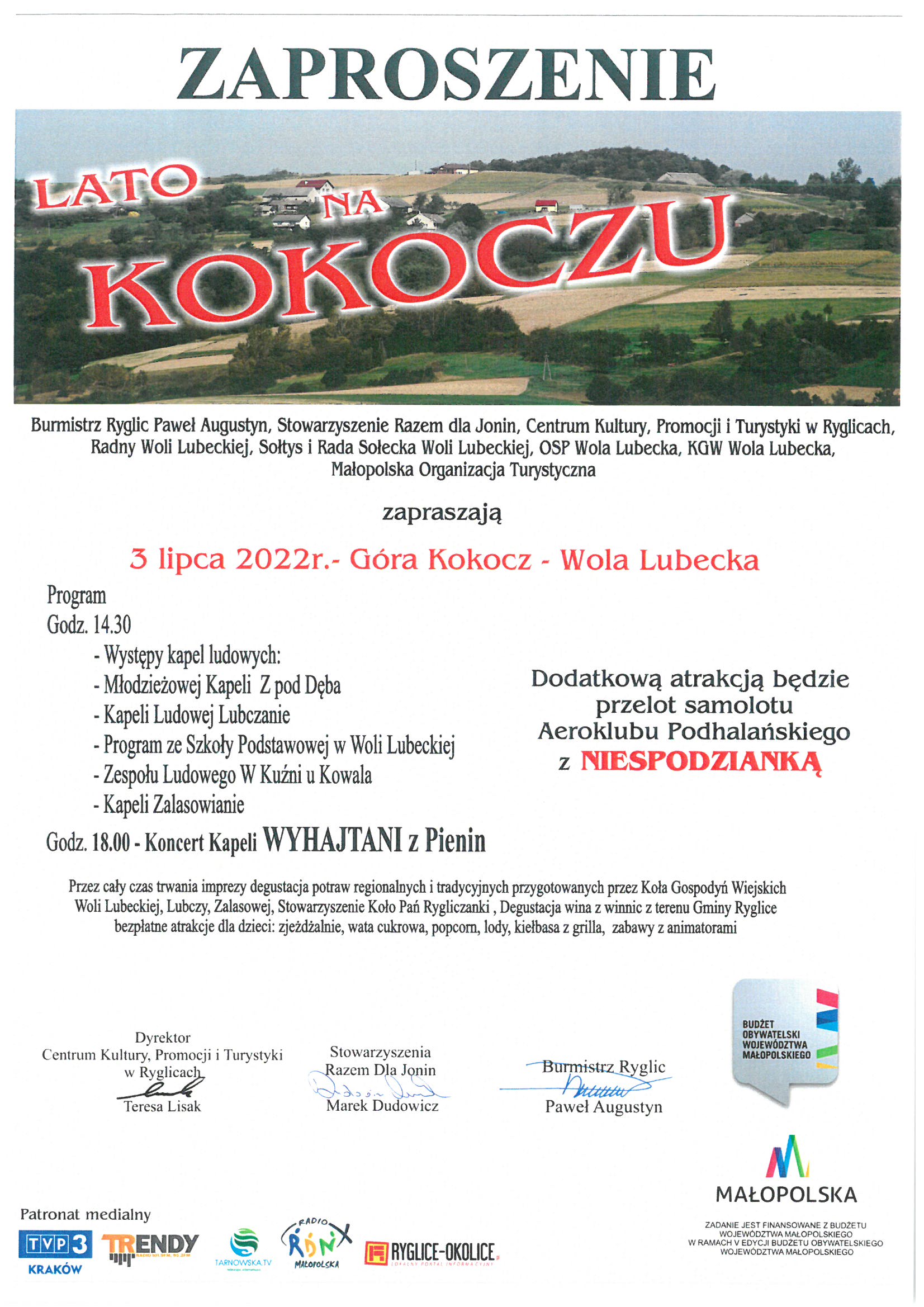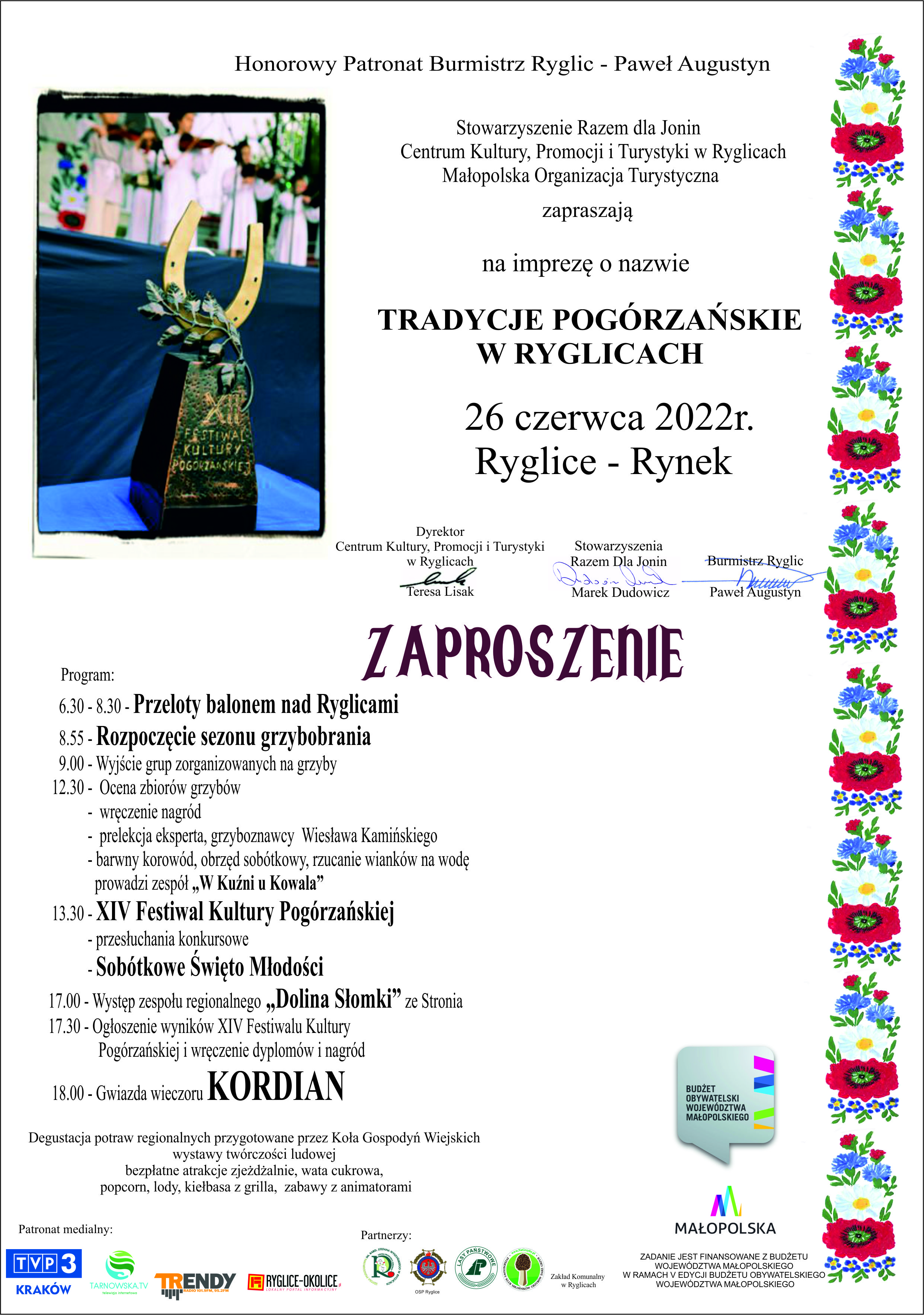W imieniu Burmistrza Ryglic Pawła Augustyna i organizatorów serdecznie zapraszamy na imprezę o nazwie Tradycje Pogórzańskie w Ryglicach. Życzymy udanej imprezy :)