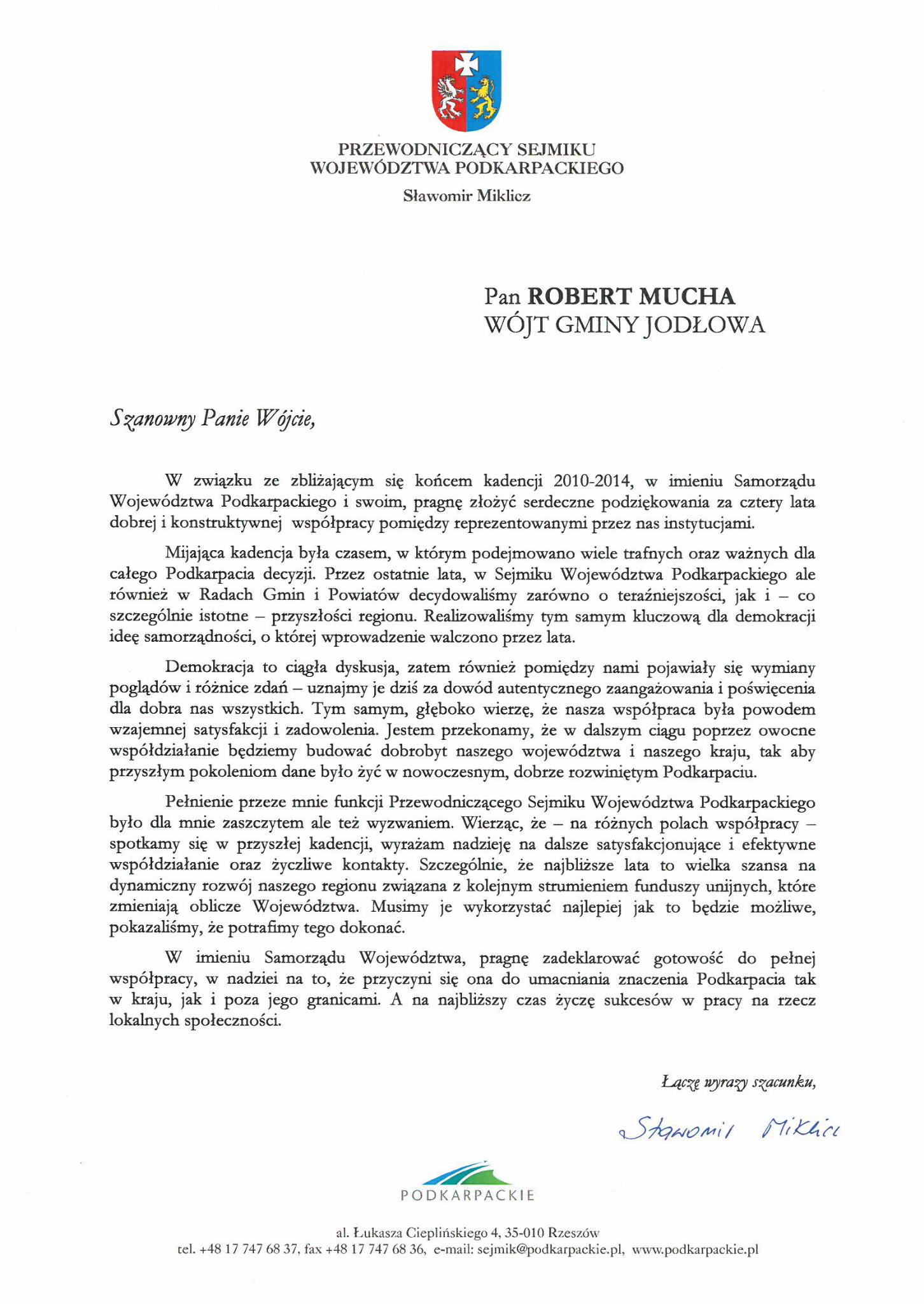 Podziękowanie Przewodniczącego Sejmiku Województwa Podkarpackiego