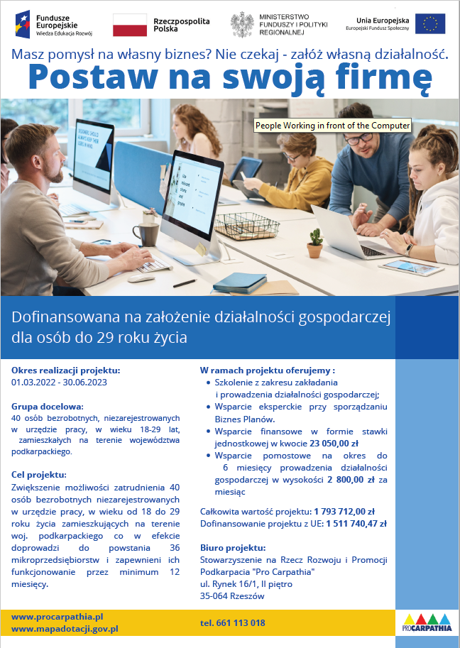Uprzejmie informujemy, że Stowarzyszenie na Recz Rozwoju i Promocji Podkarpacia „Pro Carpathia” realizuje projekt „Postaw na swoją firmę” w ramach Programu Operacyjnego Wiedza Edukacja Rozwój 2014-2020.