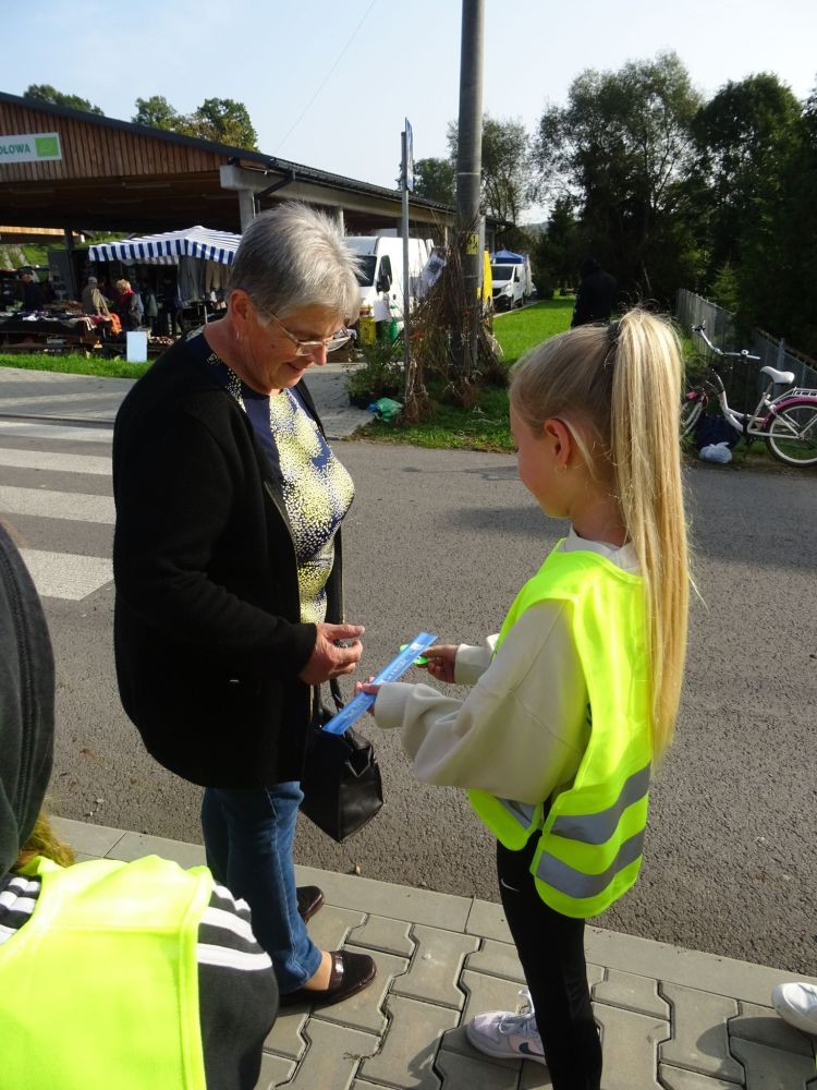 Druga akcja miała miejsce 17 października, gdzie uczniowie klasy IVa wraz z Panią Marią Warzecha rozdawali na rynku wykonane breloczki odblaskowe mieszkańcom, seniorom, przechodniom.