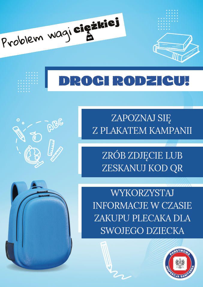 Okres wakacji to dla wielu rodziców czas zakupu nowego plecaka dla ich pociech. Zdrowie i bezpieczeństwo dzieci i młodzieży zawsze jest w obszarze działania Państwowej Inspekcji Sanitarnej, dlatego prosimy o zapoznanie się z informacją o Kampanii pt. „Problem Wagi Ciężkiej”.