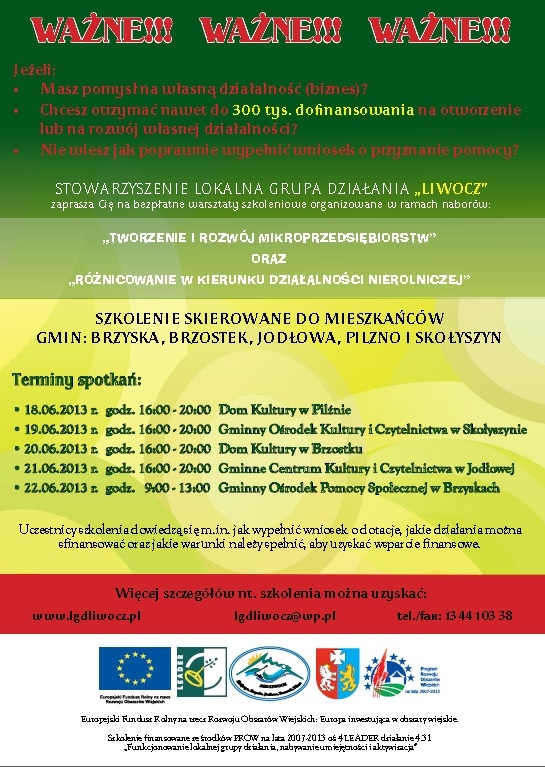 Stowarzyszenia Lokalna Grupa Działania "LIWOCZ" zachęca do składania wniosków o przyznanie pomocy w ramach działania "Wdrażanie lokalnych strategii rozwoju" objętego Programem Rozwoju Obszarów Wiejskich 2007-2013.
