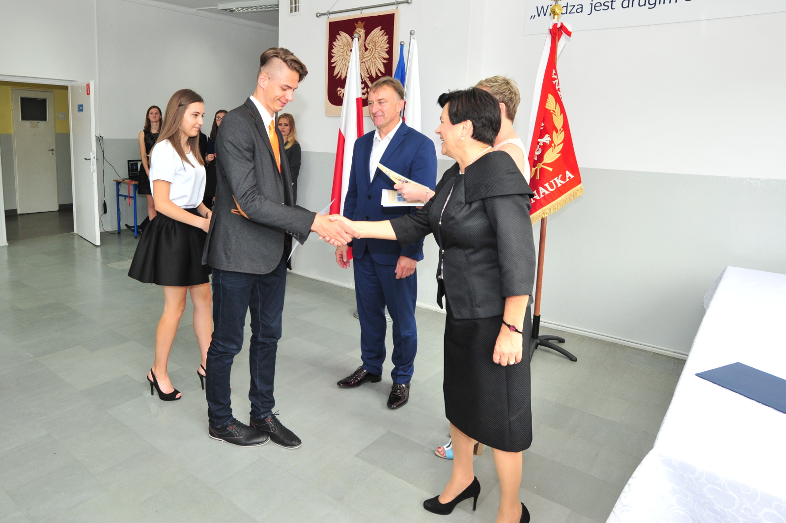 O 8.00 uczestniczyliśmy w uroczystej Mszy św., aby później przejść do szkoły i otrzymać wypracowane świadectwa oraz nagrody za bardzo dobre wyniki w nauce, wzorowe zachowanie czy reprezentowanie szkoły w konkursach, uroczystościach lub zawodach sportowych. Swoją obecnością na uroczystości zakończenia roku szkolnego 2016/2017 zaszczycili nas pan wójt Robert Mucha oraz ksiądz proboszcz Zenon Tomasiak, kierując do nas słowa gratulacji za osiągnięte wyniki i życzenia słonecznych, bezpiecznych wakacji. Pani dyrektor Teresa Połoska, również składając nam wyrazy uznania za osiągnięte wyniki, wręczyła wyróżniającym się uczniom świadectwa z czerwonym paskiem oraz pamiątkowe nagrody i dyplomy. Nauczyciele za swoją pracę otrzymali od uczniów piękne kwiaty, a dzięki staraniom rodziców mogli cieszyć podniebienie pysznym tortem.