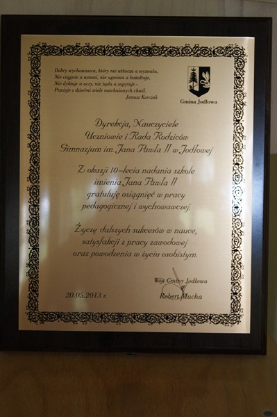 ”Ojciec Święty Franciszek udziela całym sercem upragnionego Błogosławieństwa Apostolskiego dla Dyrektora Jana Kociołka i całej społeczności szkolnej gimnazjum w Jodłowej z okazji 10 - tej rocznicy nadania szkole Imienia Jana Pawła II. Po mszy świętej odbył się przemarsz uczestników do budynku sali gimnastycznej Gimnazjum.