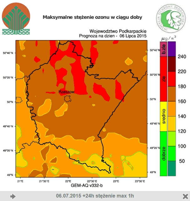 Według prognozy krajowej sporządzanej przez Główny Inspektorat Ochrony Środowiska w dniu dzisiejszym w godzinach popołudniowych na terenie województwa podkarpackiego (szczególnie w rejonach północnych) prognozowane są stężenia ozonu przekraczające 180 µg/m3 tj. poziom informowania społeczeństwa o ryzyku wystąpienia poziomu alarmowego.