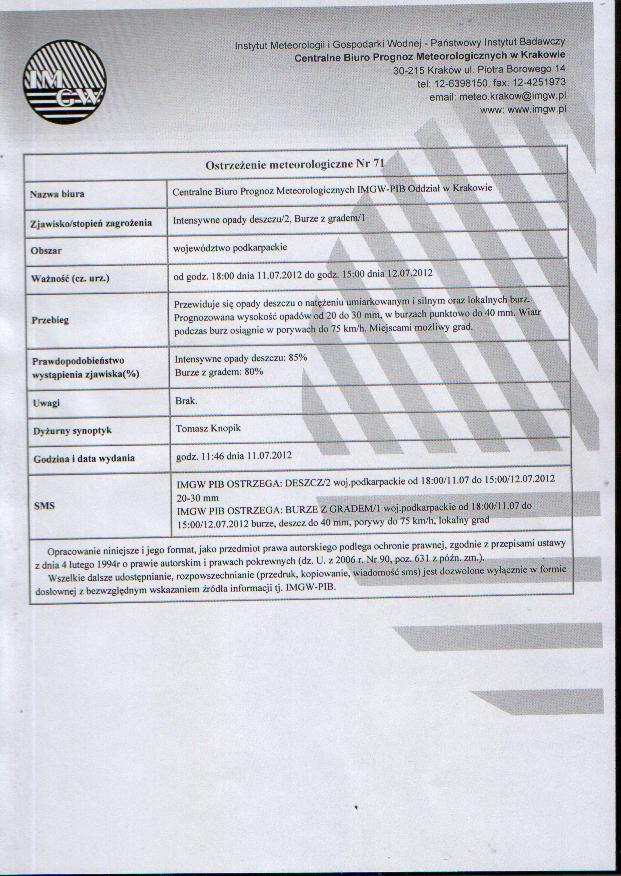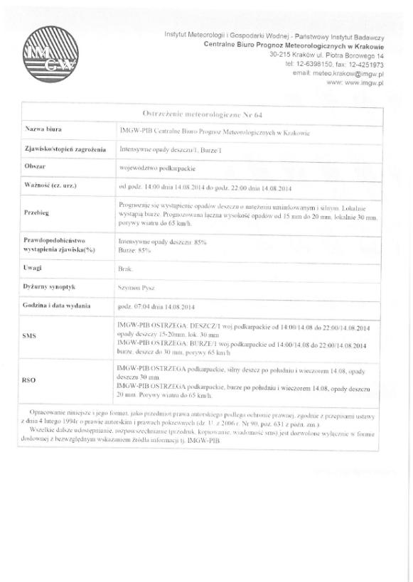 Przebieg: Przewiduje się wystąpienie burz, lokalnie z opadami gradu. Prognozowana wysokości opadów burzowych od 10 do 20 mm, lokalnie do 30 mm. Wiatr w porywach może osiągać prędkość do70 km/h. Uwagi: Brak.