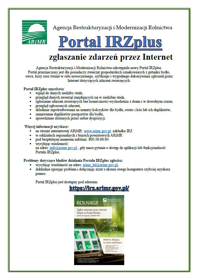 ARiMR udostępniła nowy Portal IRZplus. Portal przeznaczony jest dla posiadaczy zwierząt gospodarskich oznakowanych z gatunku bydło, owce, kozy oraz świnie w celu nowoczesnego, szybkiego i wygodnego dokonywania zgłoszeń przez Internet dotyczących zdarzeń zwierzęcych. Szczegóły na załączonym plakacie.