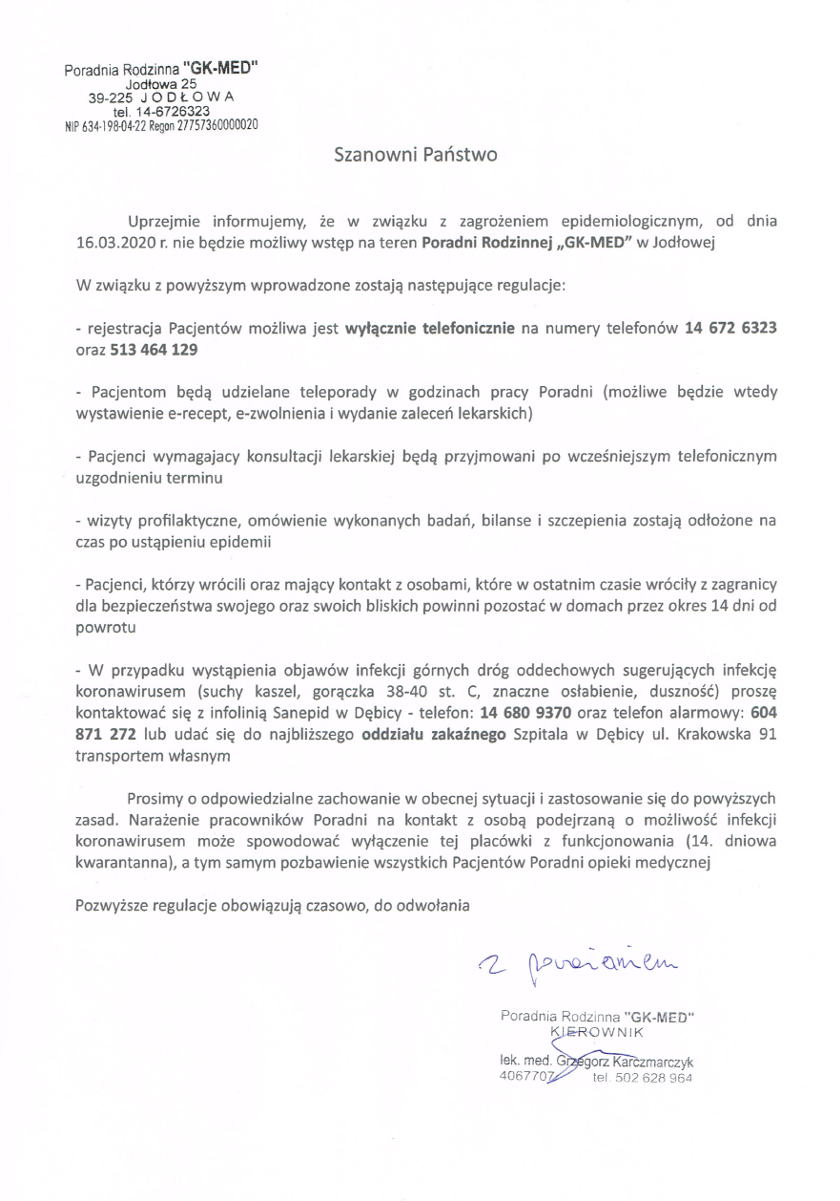 Informacja Poradni Rodzinnej "GK-MED" w Jodłowej