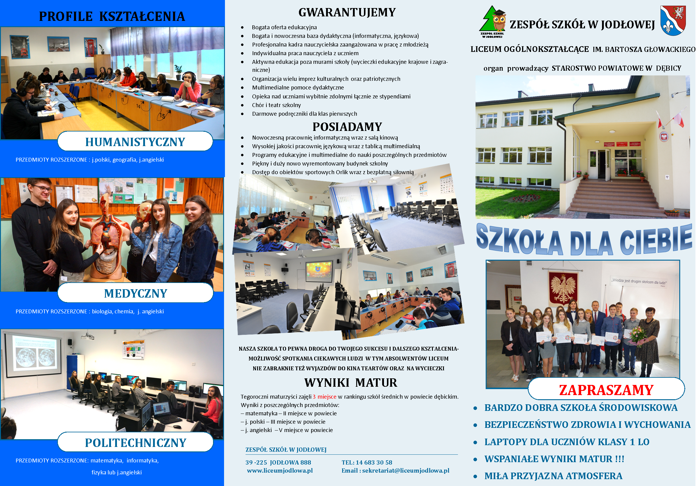 Zbliża się czas, kiedy staniecie przed ostatecznym wyborem szkoły ponadgimnazjalnej. Przed podjęciem tak ważnej decyzji życiowej bardzo proszę o zapoznanie się ofertą Liceum Ogólnokształcącego im. Bartosza Głowackiego w Jodłowej. Jest to szkoła z prawie 75 - letnią tradycją, przyjazna, wolna od przemocy i narkotyków. W tym roku proponuje naukę w 3 profilach: humanistycznym, medycznym i politechnicznym.