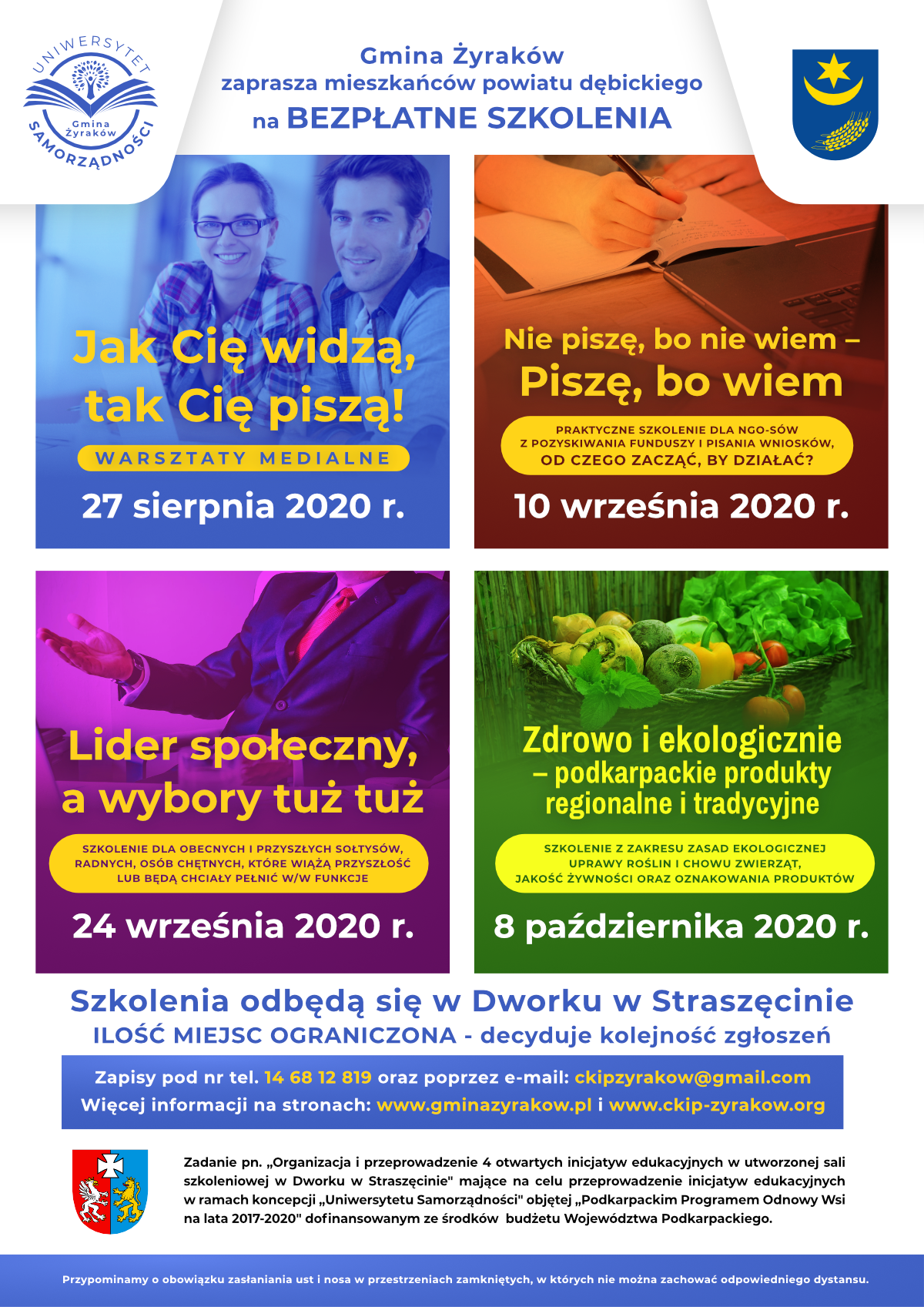 Już dziś serdecznie zapraszamy mieszkańców powiatu dębickiego do wzięcia udziału w organizowanych bezpłatnych szkoleniach o tematyce samorządowo-obywatelskiej, promocyjno-gospodarczej i ekologicznej: