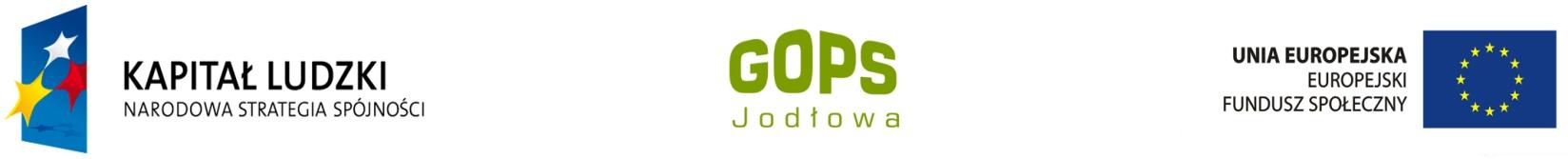 W wyniku przeprowadzonej rekrutacji w okresie styczeń - luty 2012r. do udziału w projekcie zakwalifikowano 10 osób, mieszkańców gminy Jodłowa, korzystających z różnych form wsparcia w Gminnym Ośrodku Pomocy Społecznej w Jodłowej.