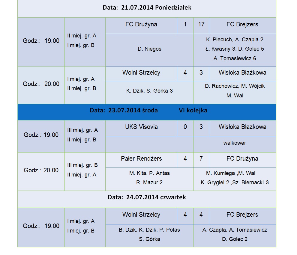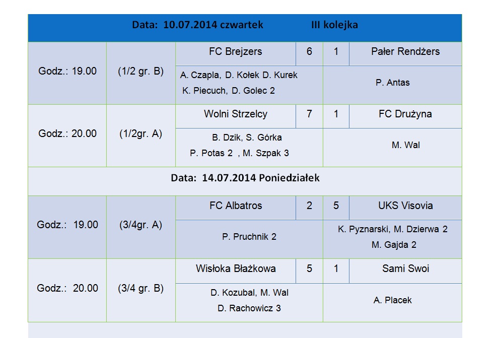 Mecz ten zasługiwał na wielki finał, dostarczył pięknych emocji dla kibiców licznie zgromadzonych na Orliku. W regulaminowym czasie gry bliżej zwycięstwa była drużyna FC Brejzers która to prowadziła 3:1, ale drużyna Wolnych strzelców walczyła do ostatniego gwizdka i doprowadziła do remisu 3:3 , a później strzelając bramkę w dogrywce na 4:3 była blisko końcowego triumfu. . Ale znowu w końcówce dogrywki FC Brejzers pokazała charakter doprowadzając do rzutów karnych, w których miała więcej szczęścia sportowego, wygrywając 5:3.
