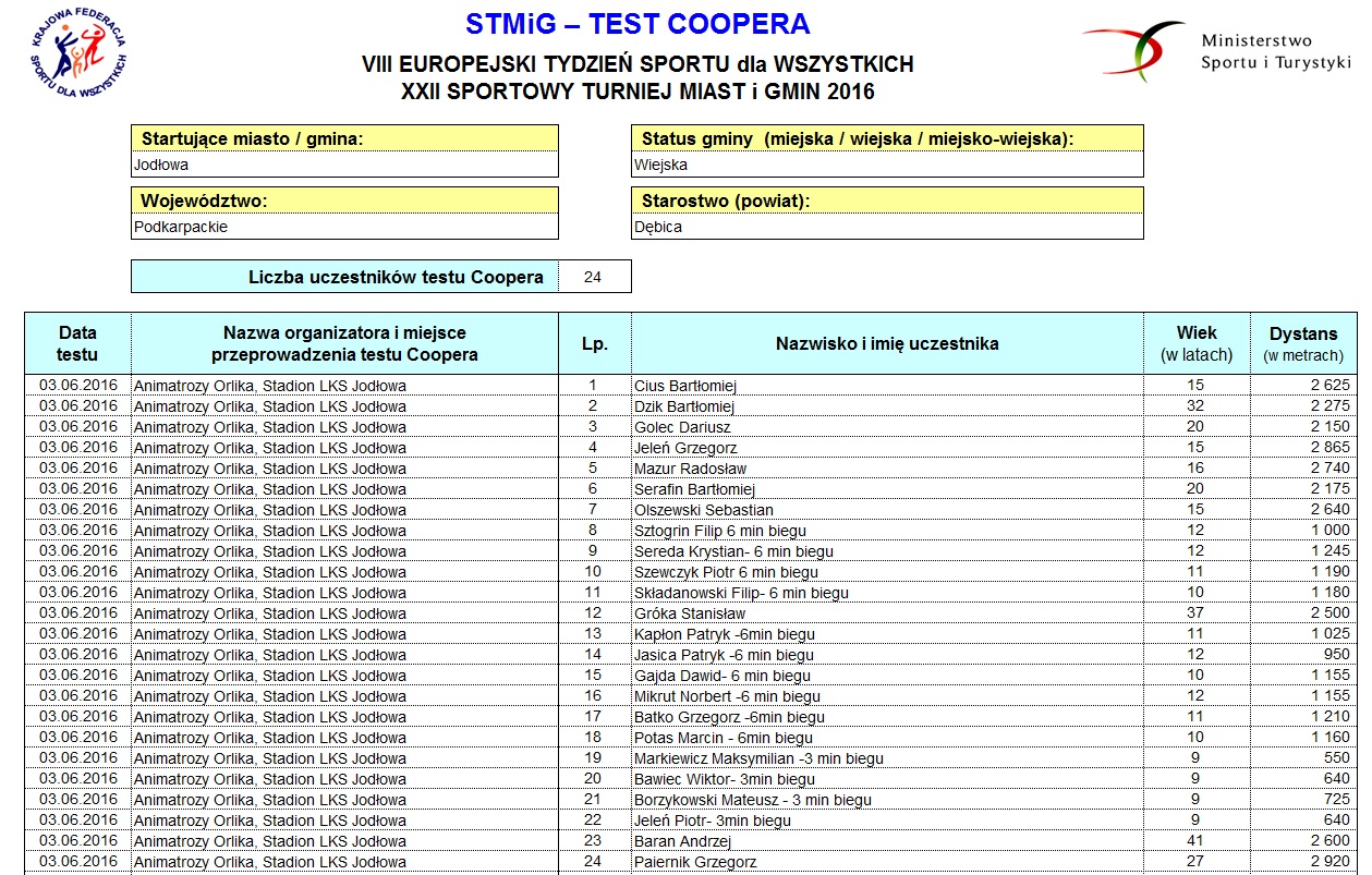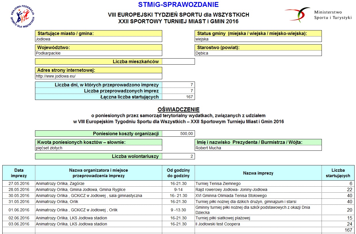 W dniach od 27 maja do 03 czerwca 2016 roku, odbył się VIII EUROPEJSKI TYDZIEŃ SPORTU dla WSZYSTKICH W GMINIE JODŁOWA, którego celem była aktywizacja ruchowa jak największej liczby naszych mieszkańców, uprawiających sport na co dzień oraz szczególnie tych, którzy nie uprawiają sportu, nie ćwiczą codziennie i nie prowadzą aktywnego fizycznie trybu życia.
